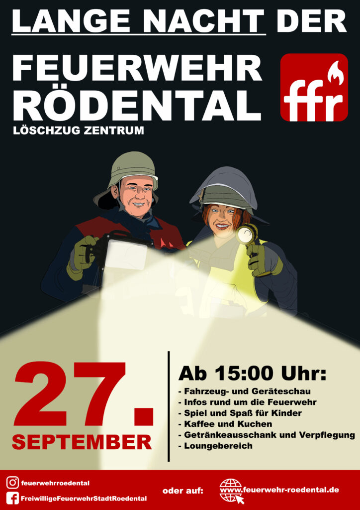 Erlebt die Lange Nacht der Feuerwehr Rödenal – am 27. September ab 15 Uhr! Fahrzeuge, Infos, Action für Kinder, Kaffee & mehr – kommt vorbei!“